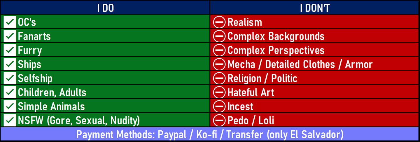 • You’ll receive constant updates throughout the process: from sketch ideas to line art, coloring, and shading. This ensures that any questions or suggestions are considered from the beginning and helps avoid significant changes later in the commission process.1.1 Specifications and Changes• If you have specific preferences for your commission, such as expressions, backgrounds, or poses, be sure to clearly indicate them when making the request. This will help create something that perfectly aligns with your desires.• If the final drawing doesn’t include something you wanted but didn’t specify in the initial request, unfortunately, we won’t be able to offer a refund. Therefore, it’s crucial to communicate your expectations from the outset.• If you want to make changes to the drawing once it’s finalized (and those changes aren’t due to errors on my part), you can do so for an additional fee. This ensures that the end result matches exactly what you’re looking for.• Don’t worry if you find errors in the drawing caused by my oversight—I’ll correct them free of charge, regardless of when they’re discovered.2. Payment• Accepted payment methods include PayPal and Ko-Fi for international payments, or bank transfer (only for El Salvador—national payments).• Payment is required in advance once the commission has been accepted.• The full payment (100%) must be made before work begins.• Work won’t commence until payment is received.• Complex or highly detailed characters may require an adjustment to the base price (clients will be informed accordingly).• By making the payment, the client acknowledges that they are purchasing a DIGITAL PRODUCT.• There are no refunds once payment has been made and the sketching process has started.3. Usage• Adonixs retains the rights to each produced image. Payment covers the creation of a customized work but does not transfer rights.• The final artwork may be shared by Adonixs on their social media or pages (always indicating that it’s a commissioned piece), unless the client requests otherwise.• Clients may also publish the drawings on other websites, provided proper credit is given to @_Adonixs_ on Instagram.• Commissions will always bear the signature/watermark of @_Adonixs_.4. Delivery Timelines• Commission delivery dates will be adjusted based on the quantity, complexity of the request, and my own work schedule.